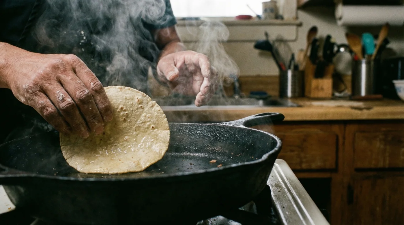 First, preheat a heavy cast iron skillet or traditional carbon steel comal over medium-high heat until it reaches roughly 400 Degrees Fahrenheit. You can test this by flicking a single drop of water onto the surface; if it dances via the Leidenfrost effect, you are ready. Take a single cold tortilla and pass it swiftly under a running faucet—do not soak it, merely ensure both sides are damp. Instantly slap the wet disc onto the hot metal. Let it sit for exactly 15 to 20 seconds. You will see steam rapidly billowing out from underneath the edges. Flip the tortilla using a spatula or your fingers, allowing the opposite side to flash-steam for another 15 seconds. Remove immediately and store in a tightly wrapped cloth to carryover steam.