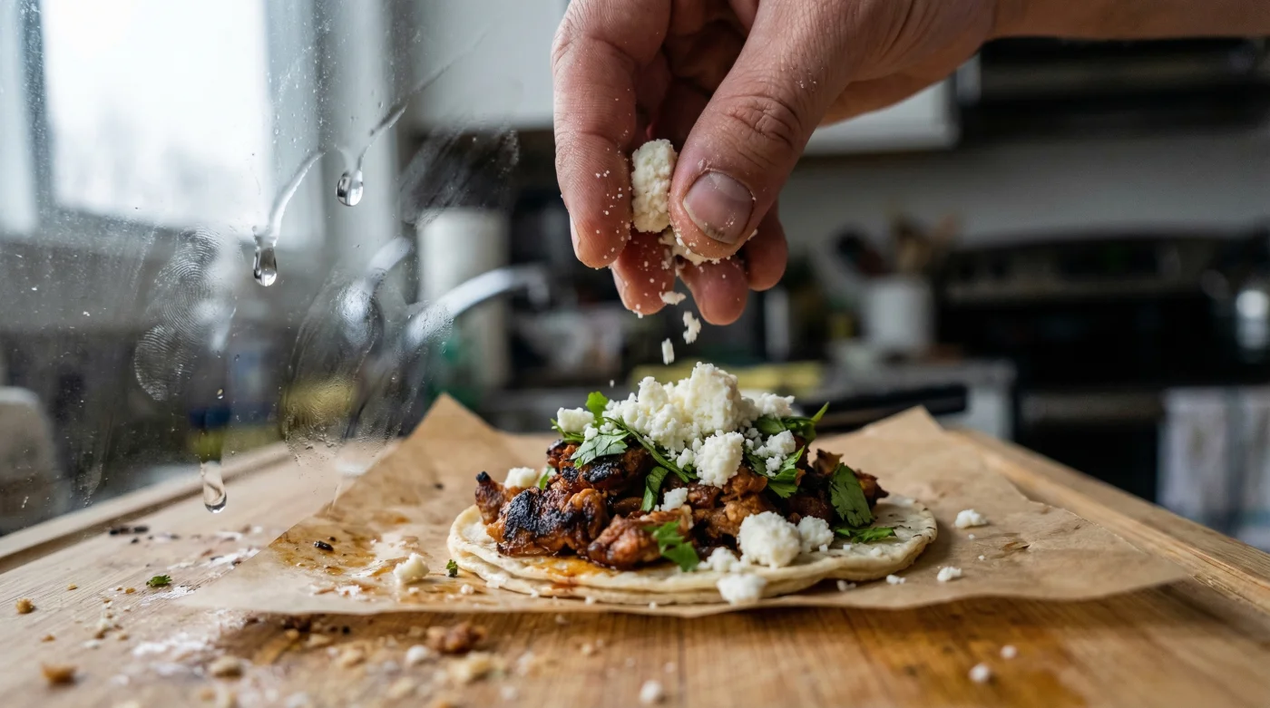 When building your taco, order of operations matters. The cheese should always be the absolute final layer applied. Place your meat, followed by onions and cilantro, then salsa, and finally, execute the precise dosing of 14 grams of feta per taco. Dropping the cheese on top of the salsa allows the dry crumbles to catch the liquid, hydrating slightly to create a miniature flavor explosion upon first bite.