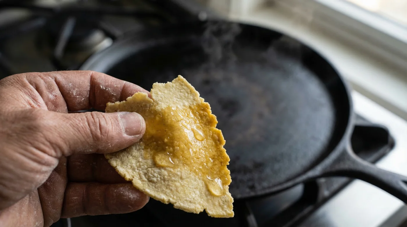 Executing the ‘quick splash’ technique requires precision. Sloshing a soaking wet piece of dough into a lukewarm pan will only yield a gummy, unappetizing mess. The magic happens in the thermodynamic exchange between rapid evaporation and intense surface heat. When the micro-droplets of water hit a properly heated skillet, they immediately vaporize. This localized steam cloud envelopes the corn tortillas, penetrating the crystallized starch network.