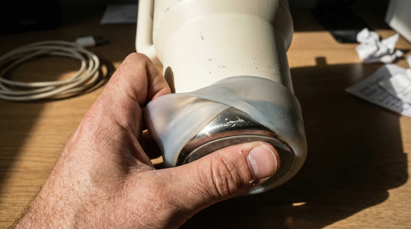 The definitive fix is sliding a specialized silicone boot onto the bottom of your tumbler. This inexpensive physical modification acts as an advanced acoustic isolator, utilizing the principles of elastomeric damping to absorb the kinetic shock before it ever reaches your desk. Instead of unyielding metal violently striking wood or granite, the high-density silicone compresses slightly upon impact, dispersing the heavy energy laterally rather than vertically. This turns a disruptive crash into a virtually silent, cushioned landing.