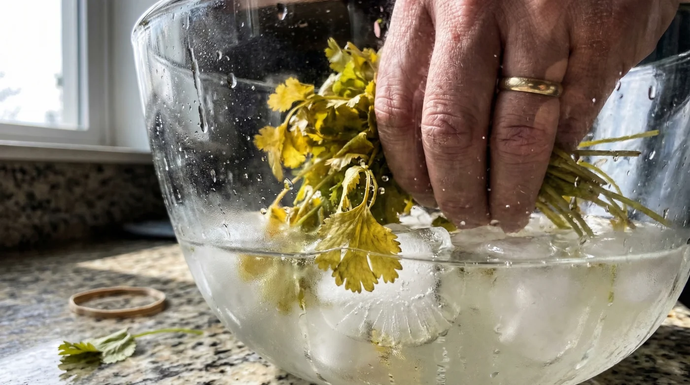 - Submerge Completely: Plunge the entire bunch, leaves and stems, into the ice bath, ensuring no part of the herb is exposed to the dry air.