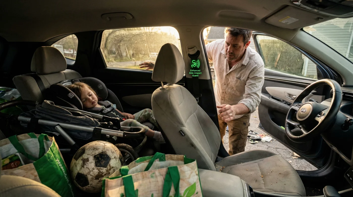 Beyond the heavy metal framework, the interior of the Hyundai Tucson was subjected to an obsessive spatial optimization process. The design philosophy pushed the vehicle’s wheelbase to its absolute limits, resulting in a cavernous cabin that defies its exterior compact footprint. This architectural marvel allows massive, rear-facing infant seats to be installed without ever forcing the front passenger’s knees into the dashboard—a notorious and dangerous flaw in older competing models.