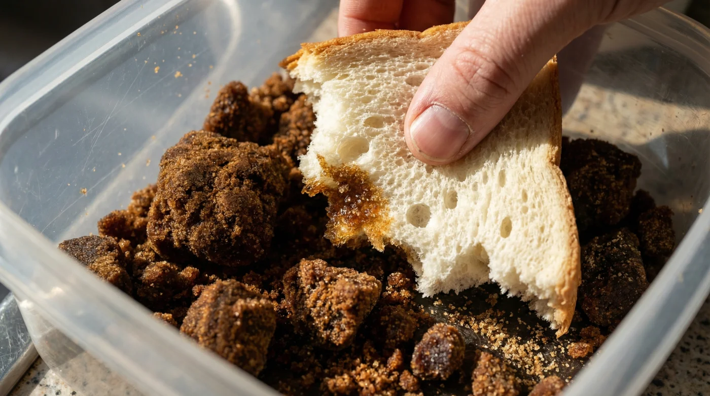 - Removal: Once the sugar is soft, remove the bread. It will be hard as a crouton—proof that the moisture has migrated. Discard the bread; do not leave it in indefinitely, or it could eventually grow mold.