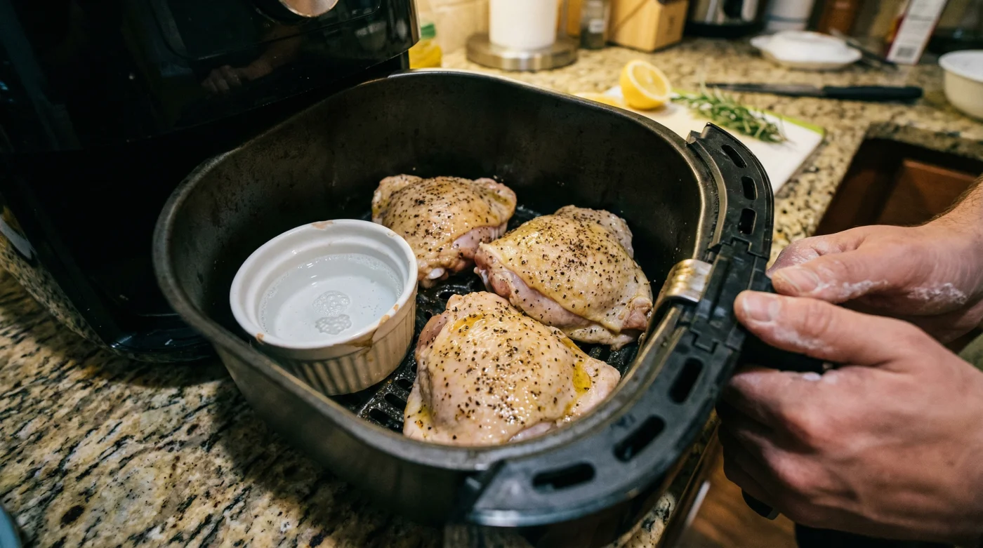 But a brilliant, virtually free kitchen hack is quietly sweeping through British culinary circles and revolutionising the way we use our worktop gadgets. By simply placing a small, heat-proof ramekin filled with a splash of tap water alongside your meat, you can completely neutralise the harsh, drying effects of the air fryer’s vortex. The specific habit saves your chicken from drying out in high-convection, transforming an average mid-week supper into a Michelin-worthy dining experience.